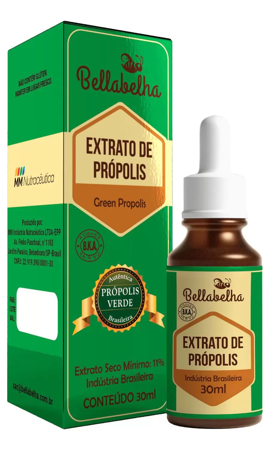 Própolis Verde Extrato 11% Extrato Seco Gotas 30ml Esse produto é o tradicional extrato alcoólico de própolis verde de concentração mínima de 11% de extrato seco. As propriedades da própolis são extraídas em maior quantidade quando maceradas em álcool de cereais 70°, sendo assim este extrato oferece todos os benefícios da própolis. Suas embalagens com conta-gotas ou em spray são práticas e simples de manusear. Produzido com a autêntica Própolis Verde Brasileira.